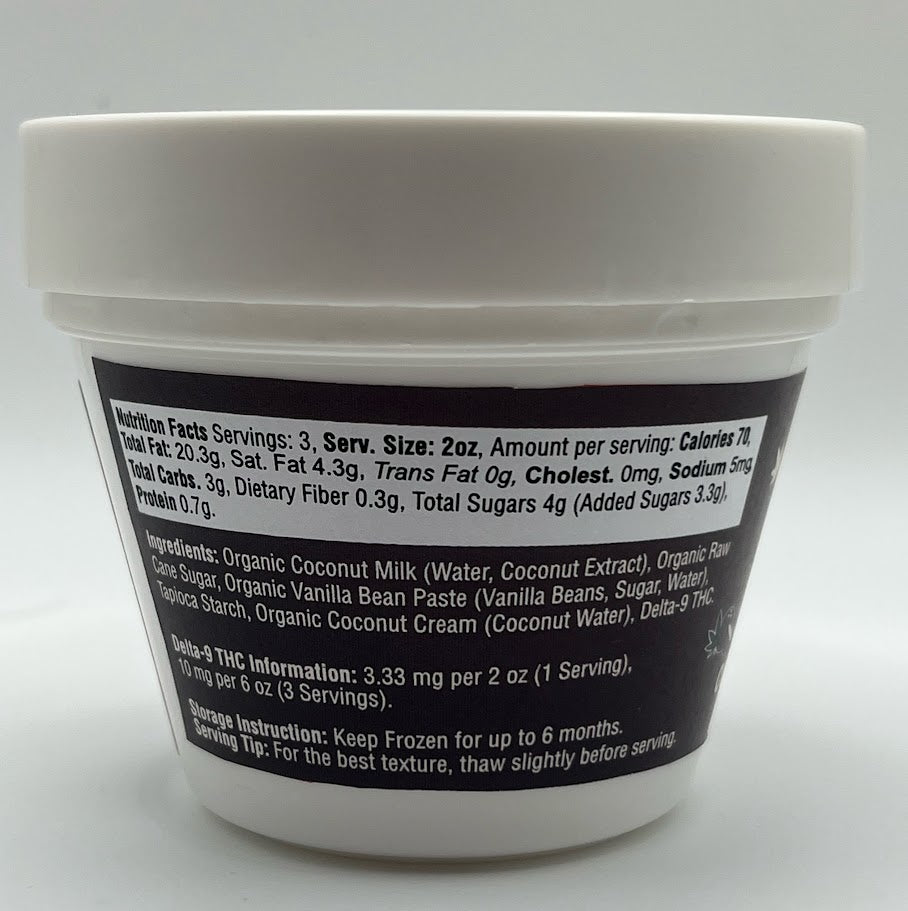 Organic Coconut Milk (Water, Coconut Extract), Organic Raw Cane Sugar, Organic Vanilla Bean Paste (Vanilla Beans, Sugar, Water), Tapioca Starch, Organic Coconut Cream (Coconut, Water), Delta-9 THC.